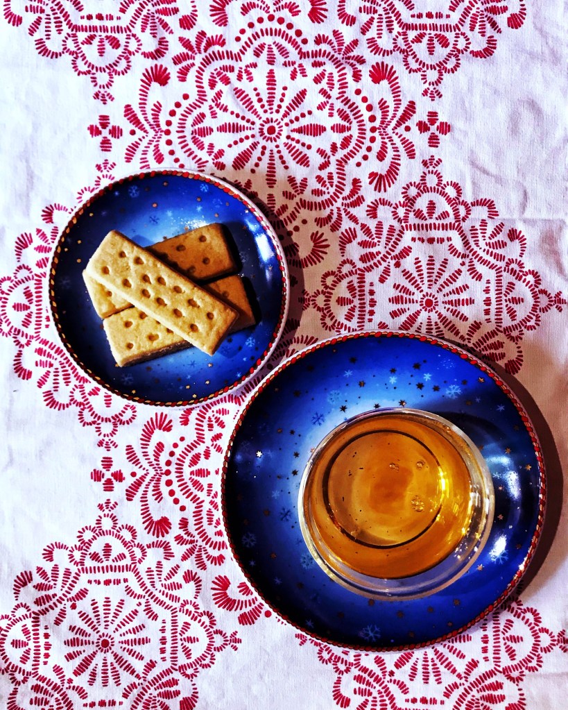 Il clima natalizio mi ispira suggestioni dai Paesi più a Nord, ed ecco che sulla tavola della merenda viene voglia di portare un piattino di burrosissimi Shortbread, i biscottini friabili scozzesi. Sotto l’albero possono essere accompagnati da una bella teiera del classico tè di Natale, la miscela a base di tè nero (ma anche verde e bianco, per chi preferisce sapori più delicati), caratterizzata da inebrianti aromi speziati e agrumati – immancabili cannella e scorza d’arancia, accompagnati da mix di spezie come cardamomo e chiodi di garofano, oppure pezzetti di mela e altra frutta disidratata. I sentori speziati si armonizzano con la burrosità dei biscotti, regalandoci calore e ripulendo la bocca… pronti per assaggiare un altro Shortbread! Io che amo i tè puri ho pensato di abbinarli per me ad un oolong cinese dei Monti Wuyi, il RouGui che ha naturalmente un aroma speziato con spiccati sentori di cannella.