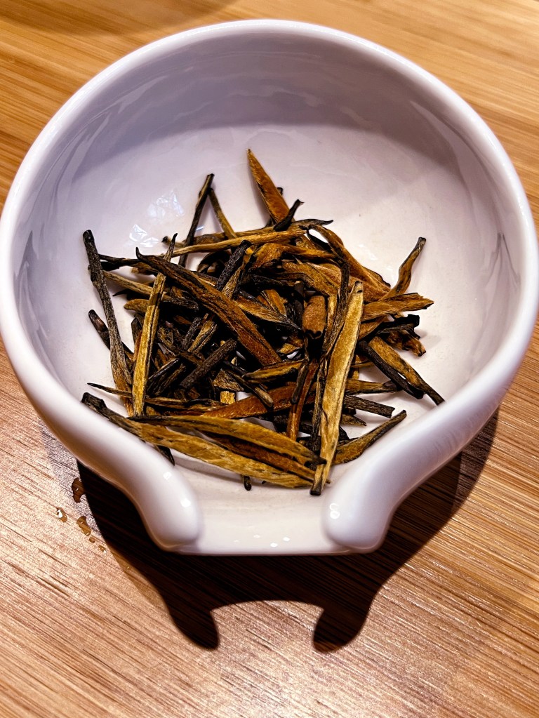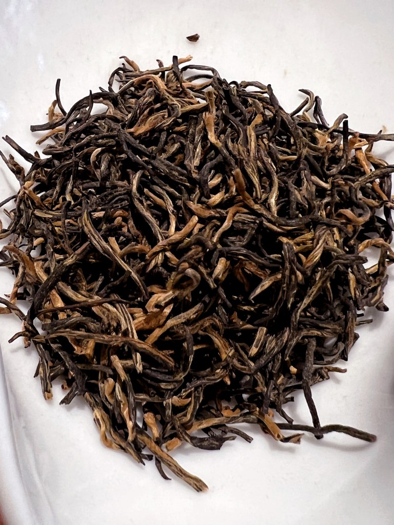 Proseguiamo con il secondo tè di quest’area, lavorato ad Hong cha: proviene dalle montagne di Dushan. Raccolto prima del 5 di aprile, ci dona foglie piccoline e una quantità di gemme dorate. È modellato a mano, anch’esso in piccole spirali. Il suo liquore è dolce, profumatissimo. Inizialmente sento cacao e una nota di nocciola tostata, poi i fiori. Una piccolissima punta di acidità e tanta dolcezza, marmellata di prugne e malto. Che tè goloso!