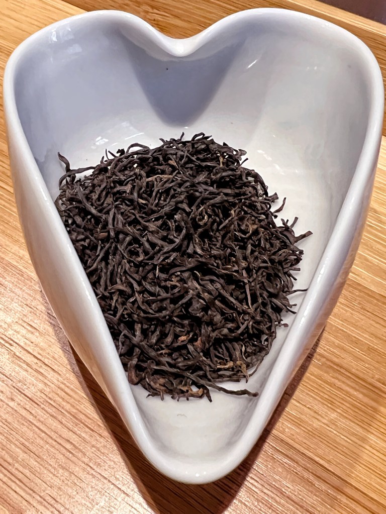 Il primo viene da Duyun ed è un Maojian, lavorato a verde. È un tè delicato, ricco di gemme, le foglioline a forma di spirale sono piccine e coperte di peluria, per cui è opportuno versare prima l’acqua nella gaiwan e solo dopo aggiungere le foglie. L’acqua si insinua nelle spiraline e le foglioline immediatamente scendono sul fondo. Morbido e fresco con note appartenenti al mondo vegetale, dagli edamame al vapore alla castagna bollita, con un finale nocciolato, dato probabilmente dal calore secco della lavorazione manuale nel wok. In particolare, la seconda infusione è densa e molto intensa, ma non amara.