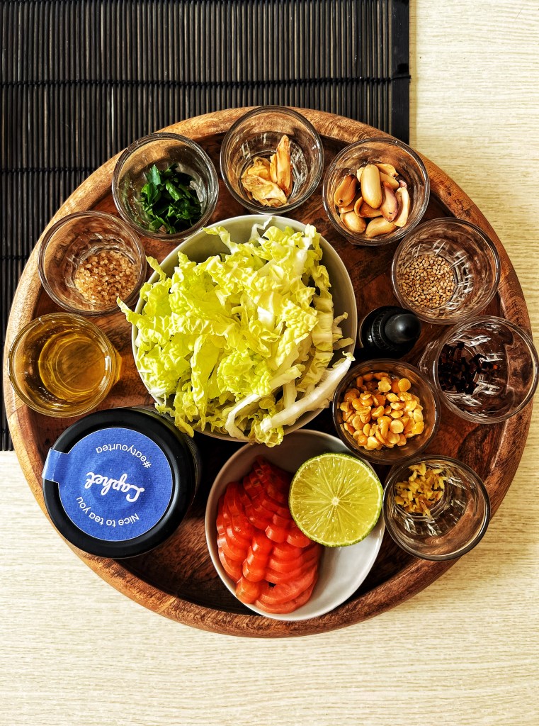 Come vedete dalle foto… il tè si mangia! Durante l’evento, io ed Enrico abbiamo preparato in diretta il Lahpet Thoke, l’insalata alla birmana: cavolo cinese, pomodoro, piselli gialli secchi, zenzero, arachidi tostate, semi di sesamo, peperoncino thailandese fresco, lime, olio all’aglio. Tutto mescolato insieme al lahpet Tea Eats.